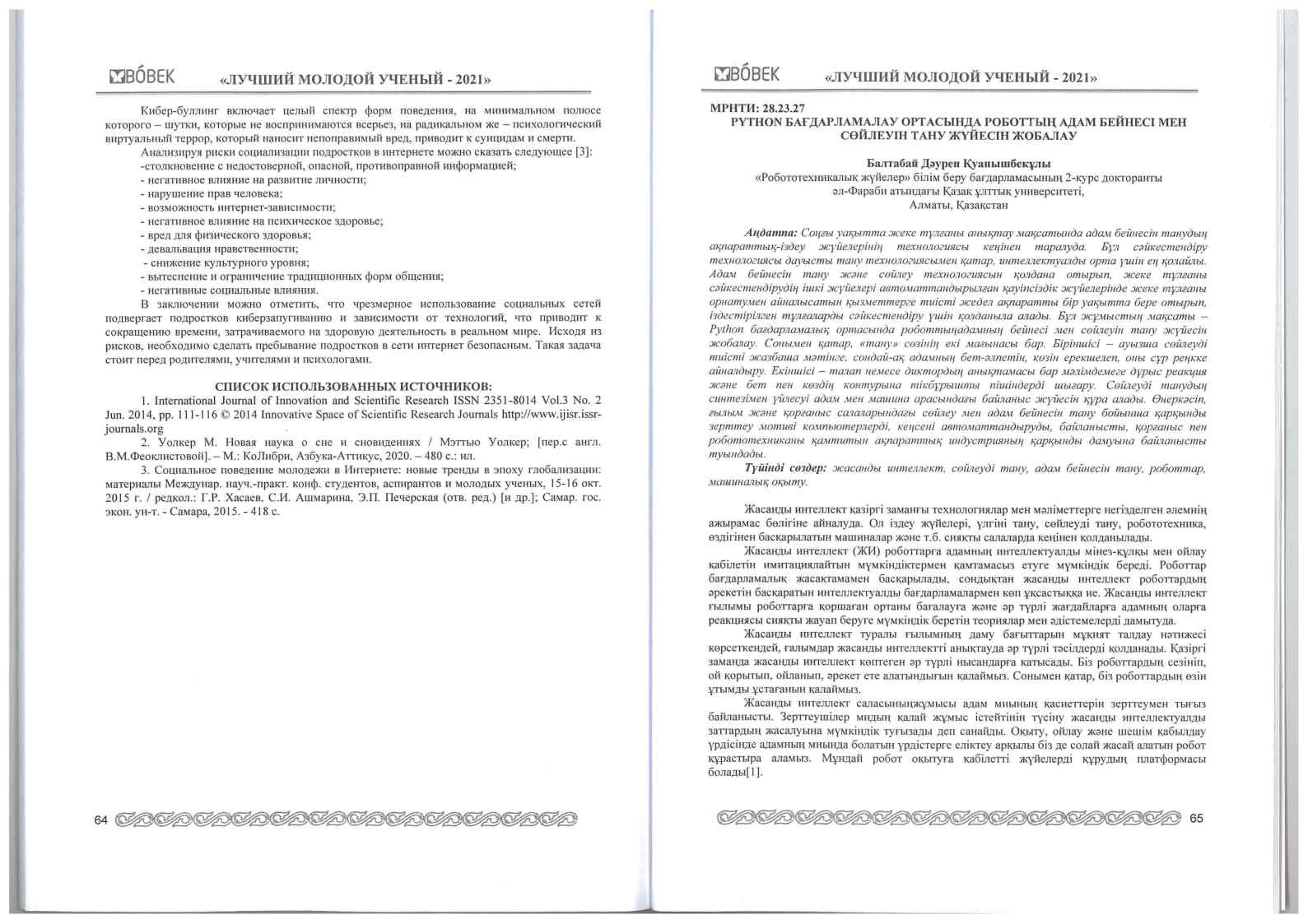 «Бөбек» жалпыұлттық қозғалыс бірлестігі қолдауымен жас ғалымдардың тұлғалық жетістіктерін және ғылымға қосқан үлесін насихаттау мақсатында Европа және ТМД елдері арасында «Үздік жас ғалым-2021» жобасы ұйымдастырылды. Жобада университетіміздің «Педагоика және психология» кафедрасының аға оқытушысы, педагогика ғылымдарының магистрі Присташ Вероника Витальевна және 6В03101- «Психология» білім беру бағдарламасының 3 курс студенті Щербакова Яна Тәуелсіз мемлекеттер достастығы ғылыми білім беру мемкемелері арасында 2 орын иеленіп, ІІ дәрежелі диплом және төсбелгімен марапатталды. Аталмыш жобаға Қазақстан, Өзбекстан, Тәжікстан, Қырғыстан, Беларусь т. б. елдердің жас ғалымдары қатысты.