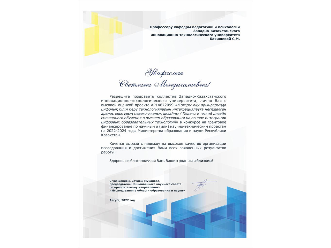 Батыс-Қазақстан инновациялық-технологиялық университеті Педагогика және психология кафедрасының оқытушылары ҚР Білім және ғылым министрлігінің 2022 жылғы «2» наурыздағы № 27-нж бұйрығымен бекітілген 2022-2024 жылдарға арналған ғылыми және ғылыми-техникалық жобалар бойынша гранттық қаржыландыруға арналған конкурсқа «Жоғары оқу орындарында цифрлық білім беру технологияларын интеграциялауға негізделген аралас оқытудың педагогикалық дизайны» тақырыбы бойынша ғылым жобасына қатысып грант жеңіп алды. Жоба жетекшісі: кафедра профессоры, п.ғ.д. Бахишева С.М., мүшелері п.ғ.к, қауымд.проф. Кинжекова Р.С., 7М01101 «Педагогика және психология» білім беру бағдарламасының магистранты Мұқтар Зинур және басқалары.