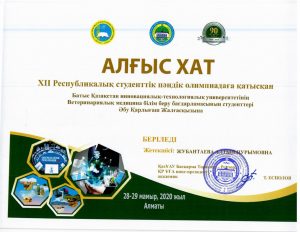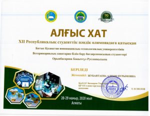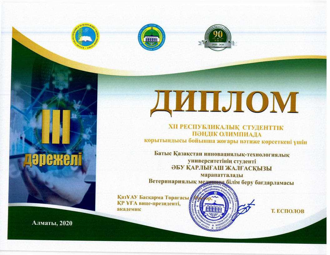 Олимпиада қорытындысы бойынша Ветеринарлық медицина мамандығы бойынша Әбу Қарлығаш жүлделі III-орынға ие болып, дипломмен марапатталды, жетекшісі ветеринария ғылымдарының магистрі А.Н. Жұбантаева алғыс хатпен марапатталды (олимпиада нәтижесі www.kaznau.kz сайтында жарияланды).