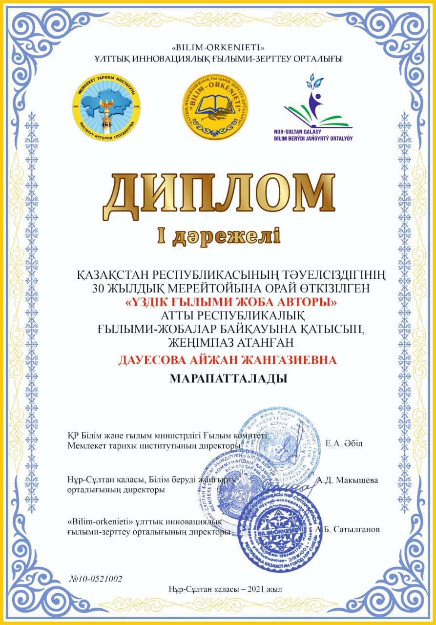Батыс Қазақстан инновациялық-технологиялық университеті «Тарих және құқық» кафедрасының аға оқытушысы, тарих магистрі Дауесова Айжан Жанғазықызы ғылым жолындағы кезекті жетістігіне қол жеткізді. Білікті жас ұстаз Нұр-Сұлтан қаласындағы “Bilim-orkenieti” ұлттық иновациялық ғылыми-зерттеу орталығы ұйымдастырған ел тәуелсіздігінің 30 жылдығына орай өткізілген «Дарынды жас ғалым» республикалық ғылыми жобалар байқауына Тарих мамандығының осы жылғы түлегі М.Қ.Ғариполланың «Ұлттық мәдениет пен салт-дәстүрдің жастар тәрбиесіндегі орны» атты ізденушілік жұмысына ғылыми жетекшілік жасаған болатын.