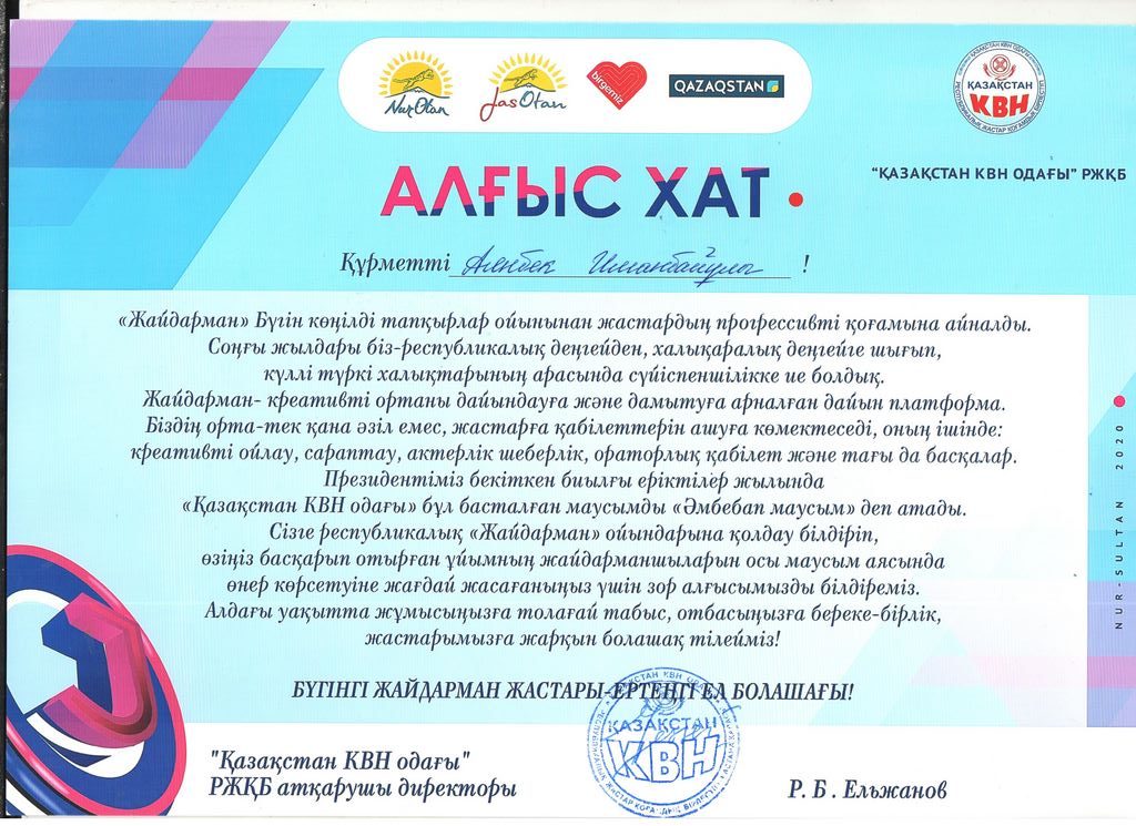 Айта кетейік, «Жаңа толқын» командасының сәтті ойын өрнегін көрсеткені үшін БҚИТУ-дың тәрбие ісі жөніндегі проректоры Аянбек Абекешевке «Қазақстан КВН одағы» РЖҚБ атқарушы директоры Р.Б.Елжановтың атынан алғыс хат берді.