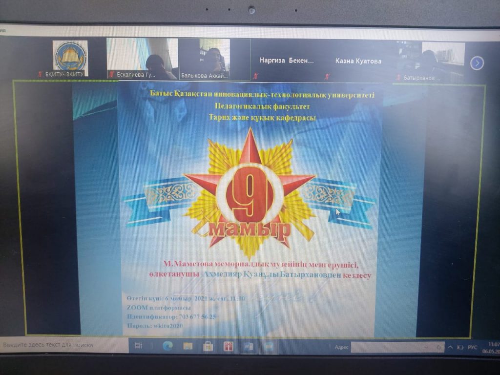 6 мая 2021 года кафедрой «История и право» Западно – Казахстанского инновационно-технологического университета была организована онлайн встреча с краеведом, заведующим мемориальным музеем им.М. Маметовой в г. Уральске Ахмедияром Куановичем Батырхановым, посвященная Дню Великой Победы. Онлайн встреча прошла в формате ZOOM. На встрече приняли участие около 50 слушателей.