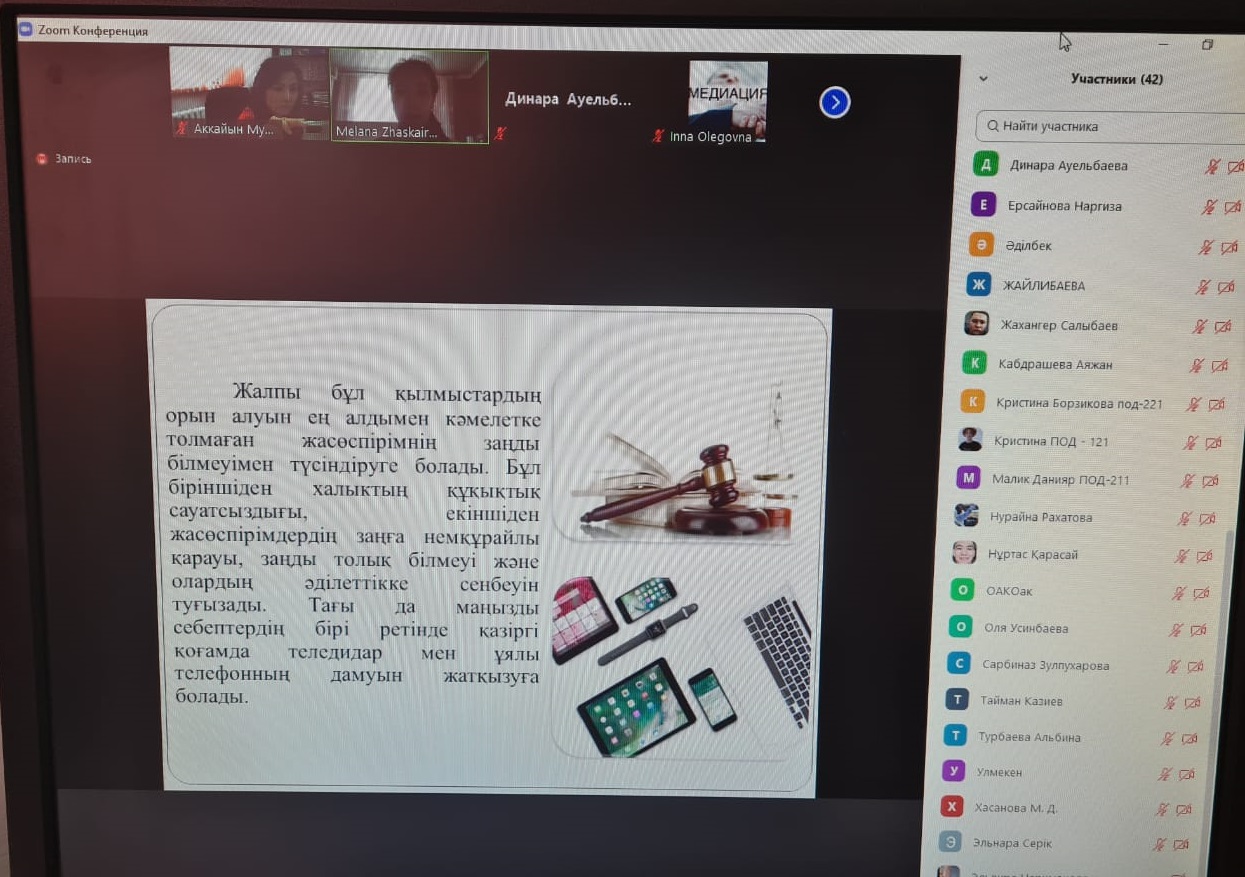6 и 7 апреля 2021 года на кафедре истории и права педагогического факультета в рамках работы XXI Международной научной конференции студентов и магистрантов «Потенциал молодежи в науке и образовании: взгляды, ориентиры, перспективы», проведены заседания секции 3 «История Казахстана и проблемы правоведения на современном этапе». Конференция организована на онлайн платформе Zoom. В программу конференции включены 39 докладов: 29 на государственном языке, 10 на русском языке. В работе данной секции приняли участие студенты и магистранты Оренбургского государственного педагогического университета, Атырауского университета имени Х. Досмухамедова, Актюбинского регионального университета имени К. Жубанова, Западно-Казахстанского инновационно-технологического университета, Западно-Казахстанского университета имени М. Утемисова. На конференции освещены разнообразные вопросы: формы заключения сделок в Республике Казахстан, правовой статус международных организаций, основные тенденции развития современной юридической науки Республики Казахстан и др. Все выступления сопровождались презентациями. Заведующая кафедрой истории и права, кандидат исторических наук, доцент Балыкова Аккайын Муратовна поблагодарила студентов и магистрантов за участие в работе конференции. По результатам работы будет опубликован сборник материалов конференции.
