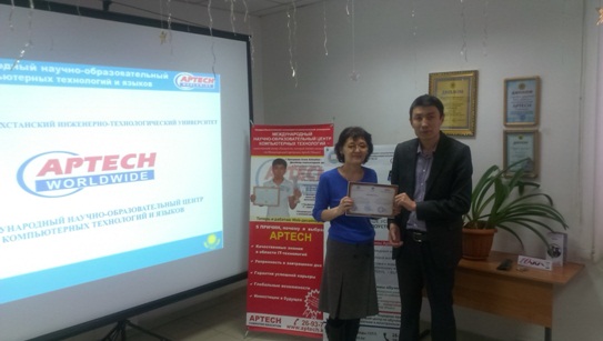 По завершению курсов учителям школ были вручены сертификаты. Вручая сертификаты о прохождении курсов повышения квалификации,  методист   городского отдела образования Ергалиев С.А. отметил, что данные курсы  способствуют  знаниям и умениям в использовании учителями  новейших информационных технологий в учебно-воспитательной и научной деятельности.