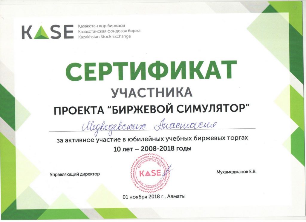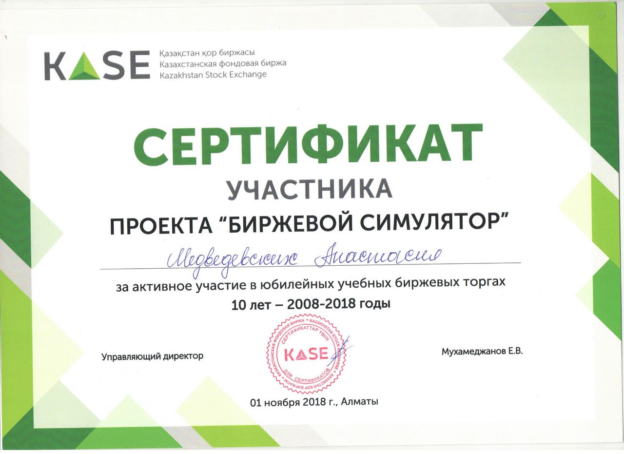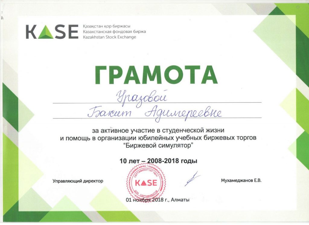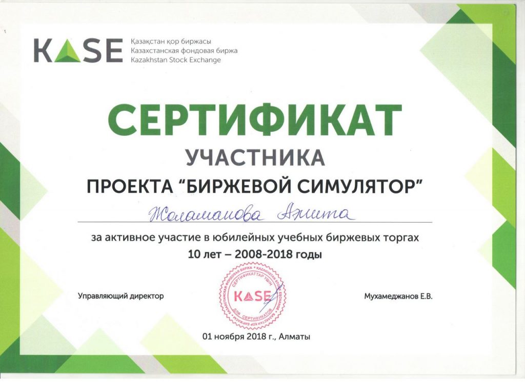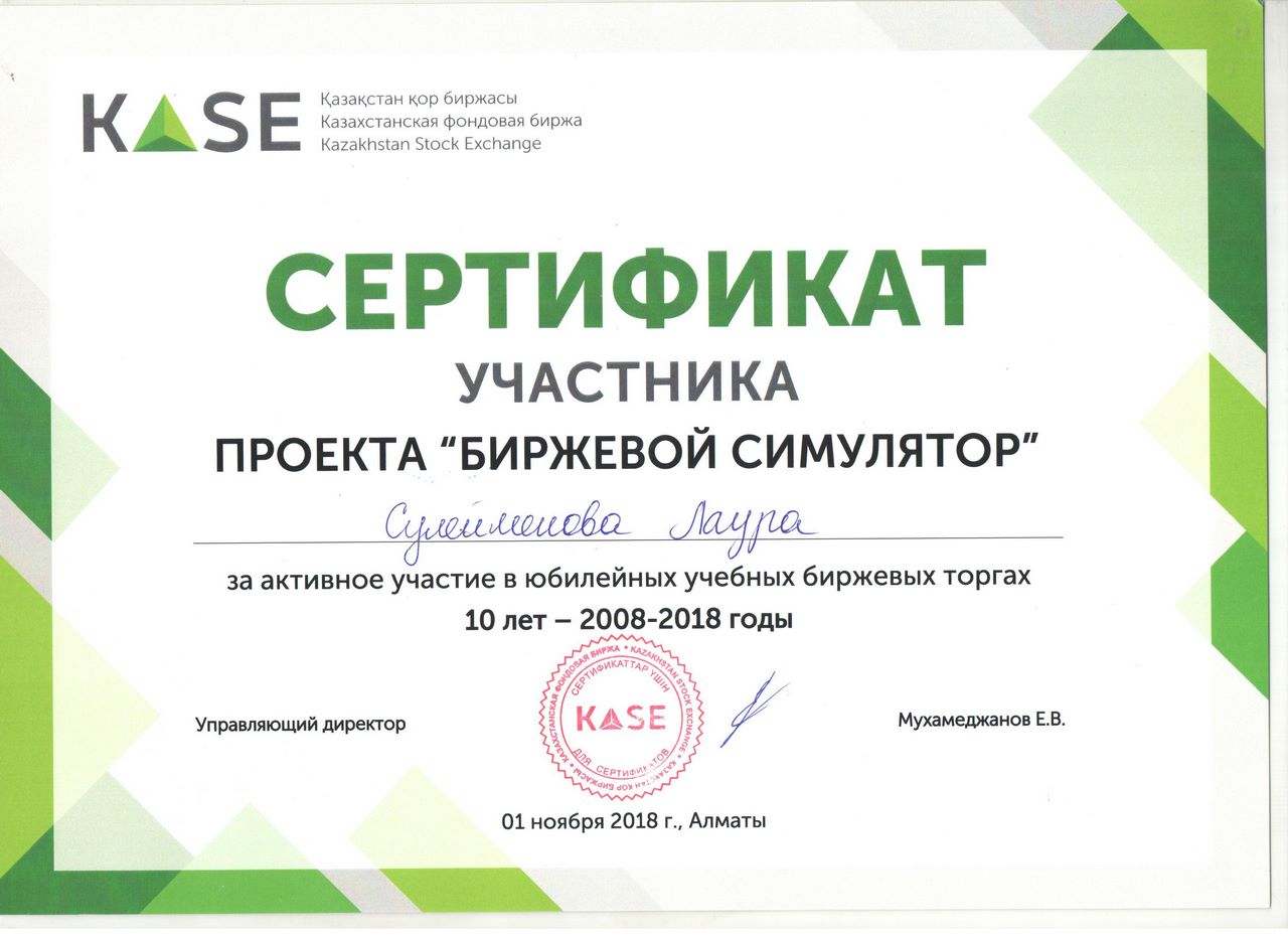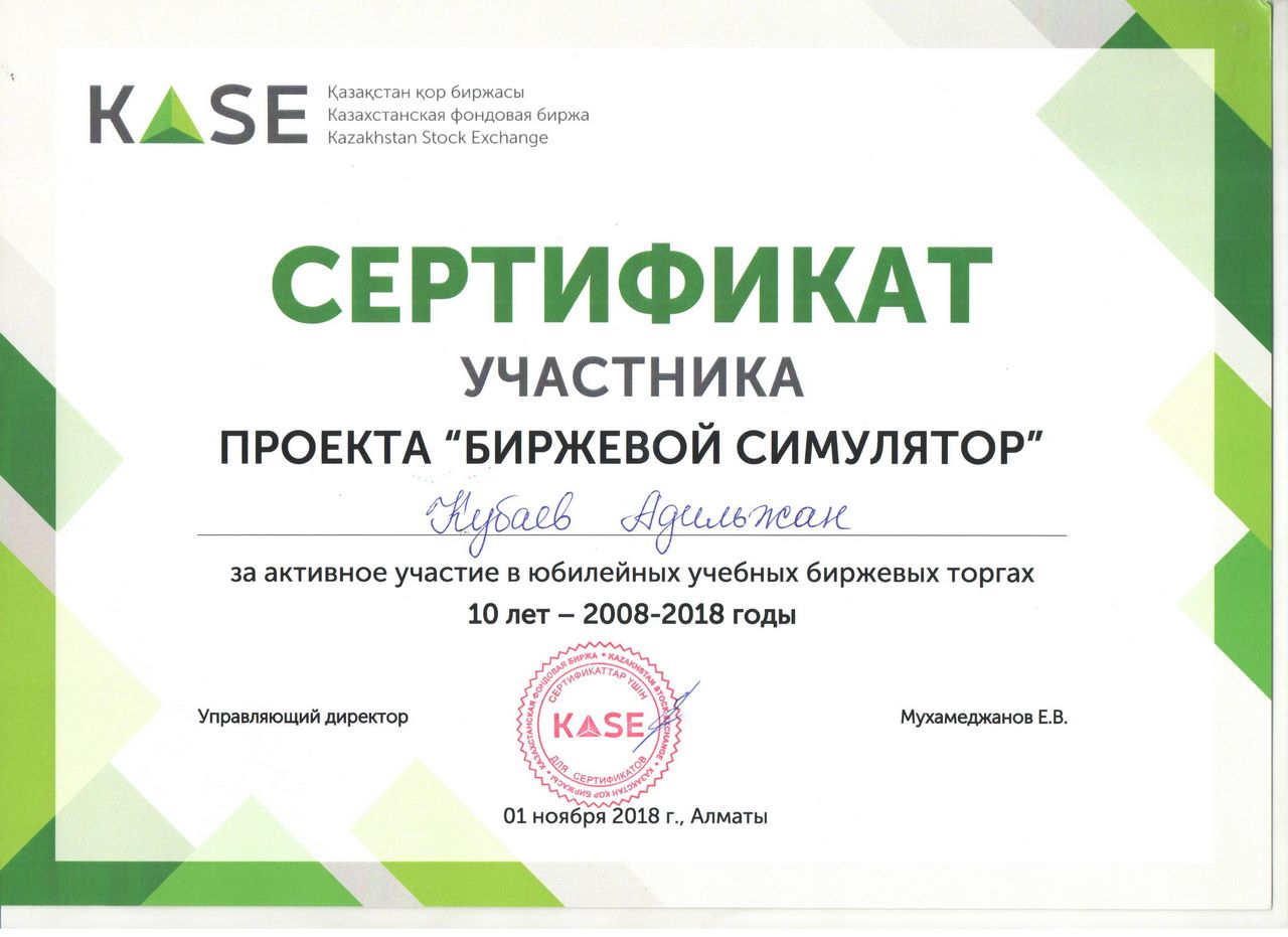 1 ноября 2018 года Казахстанская фондовая биржа (KASE) подвела итоги юбилейного конкурса «Биржевой симулятор». Данный проект реализуется десятый год подряд. В этом году в Казахстане обучающий конкурс «Биржевой симулятор» проводился с 17 сентября по 17 октября. Более 1200 студентов из 30 вузов Республики Казахстан приняли участие в торгах.