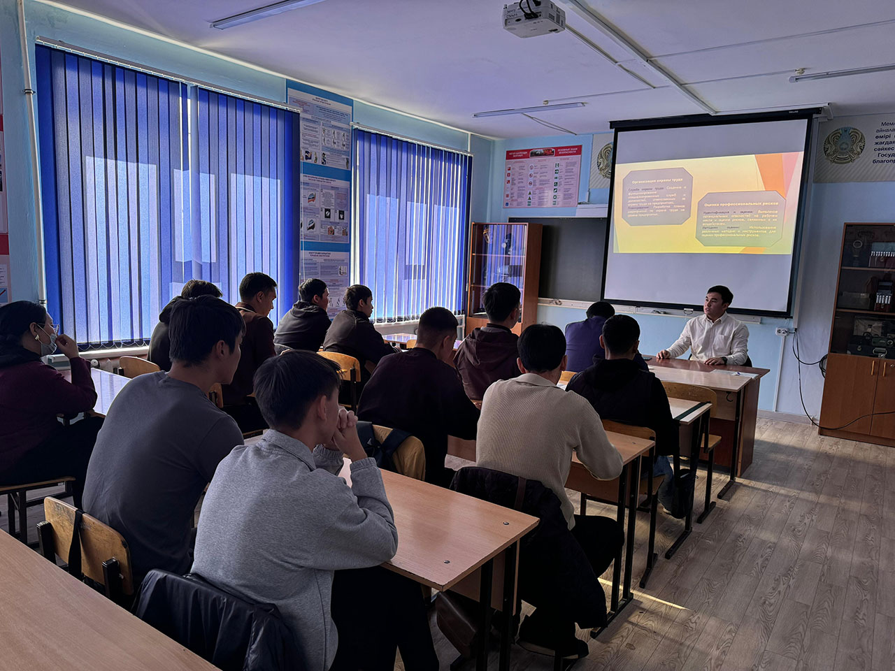 Приглашенный инженер по технике безопасности компании ТОО «Sitek Caspian» Абылайхан Саматович поделился своим опытом в области охраны труда и техники безопасности. Он также проинформировал о средствах индивидуальной и коллективной защиты при работе на производстве. Ознакомил слушателей лекции об изменениях в техническом регламенте и международных стандартах, применяемых в сфере охраны труда и техники безопасности на предприятиях.