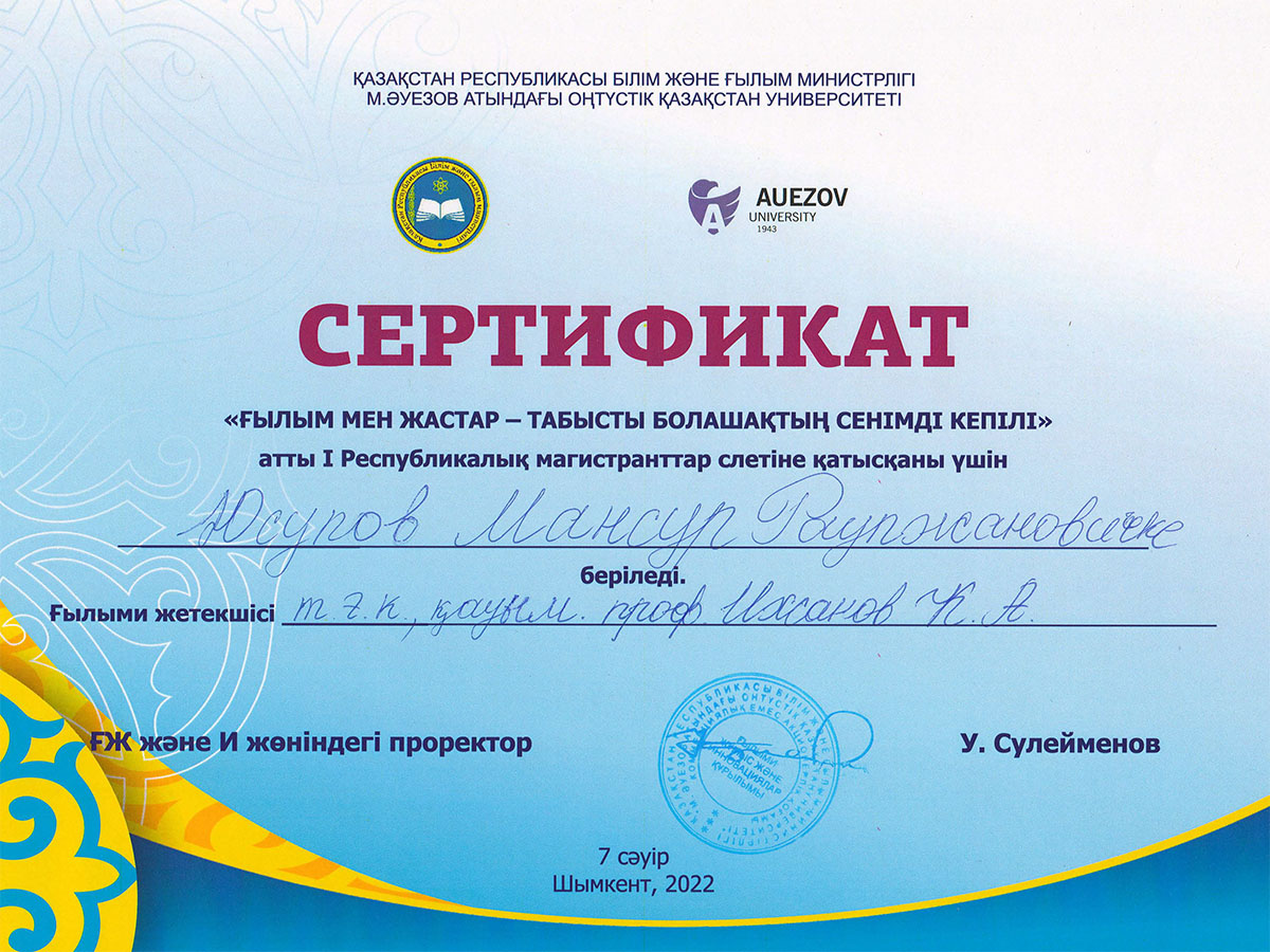 7 апреля 2022 года магистрант группы МНДП-12 Юсупов Мансур (научный руководитель к.т.н. Ихсанов К.А.) принимал участие в I Республиканском слете магистрантов «Наука и молодежь-надежный залог успешного будущего» прошедший в Южно-Казахстанском университете имени М. Ауезова.