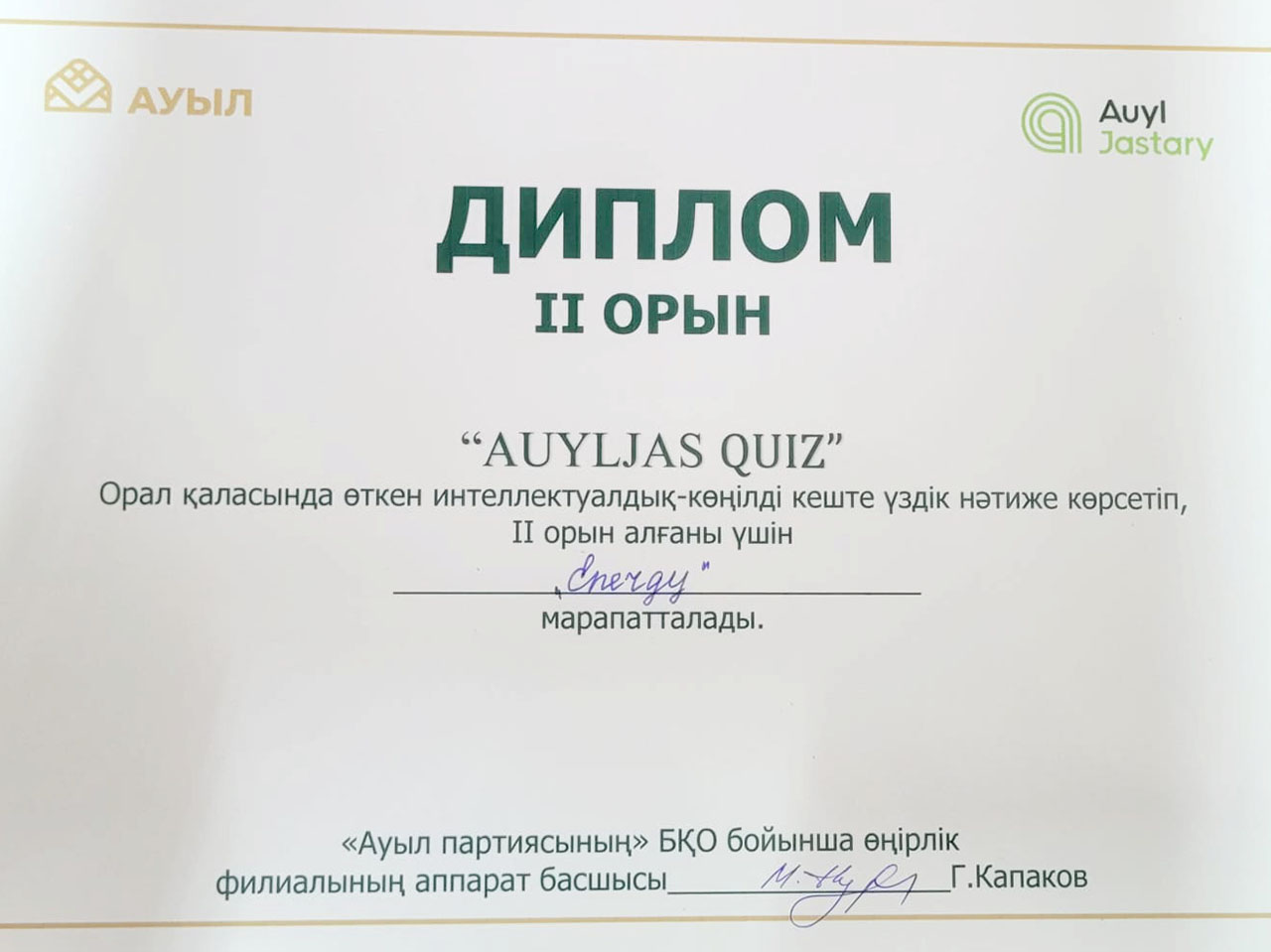 24 апреля 2026 года в городе Уральск в интеллектуальной игре AuylJas Quiz, организованной партией «Ауыл», приняли участие обучающиеся образовательной программы 6В07102 – «Электроэнергетика» кафедры энергетики, автоматизации и вычислительной техники в составе команды Energy ZKITU.