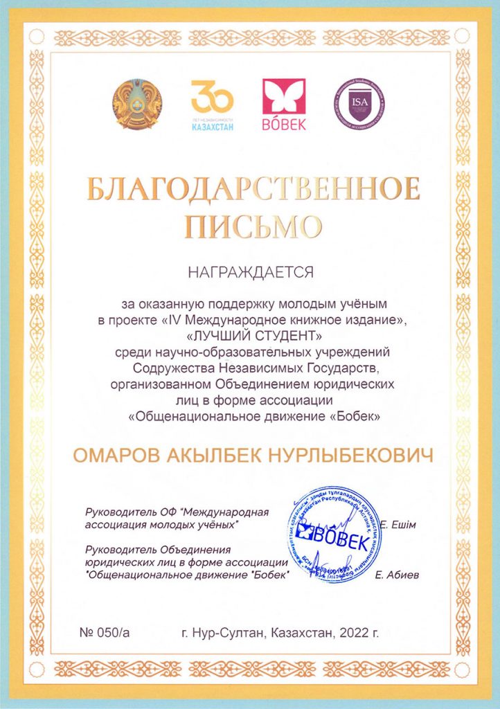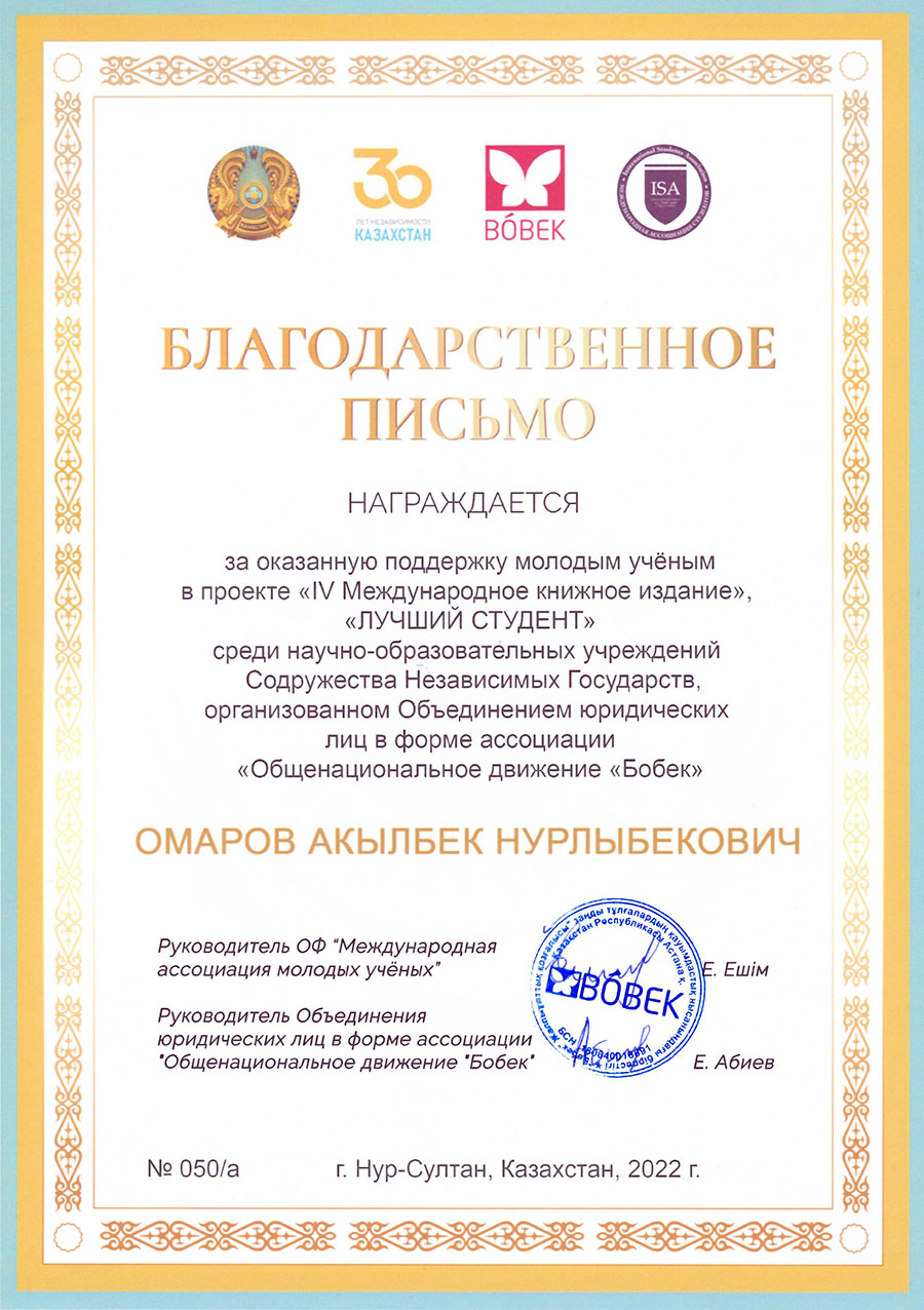 Научный руководитель асс.профессор, PhD А.Н.Омаров за оказанную поддержку молодым ученым в проекте «IV Международное книжное издание» был награжден благодарственным письмом.