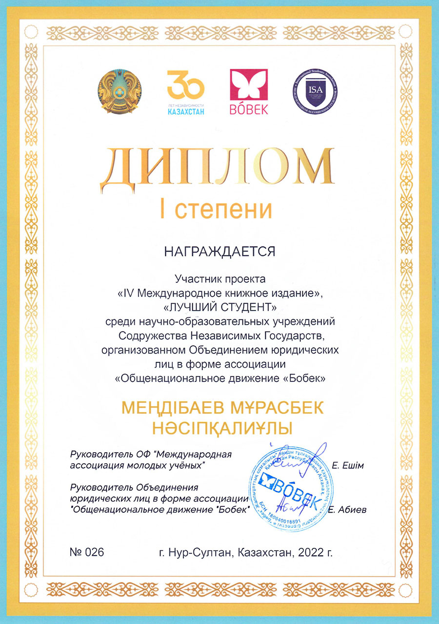 Студент II курса Меңдібаев Мұрасбек Нәсіпқалиұлы ОП 6В07101 «Транспорт, транспортная техника и технологии» кафедры техники и технологии Инженерно-гуманитарного факультета награжден Дипломом I степени «Лучший студент».