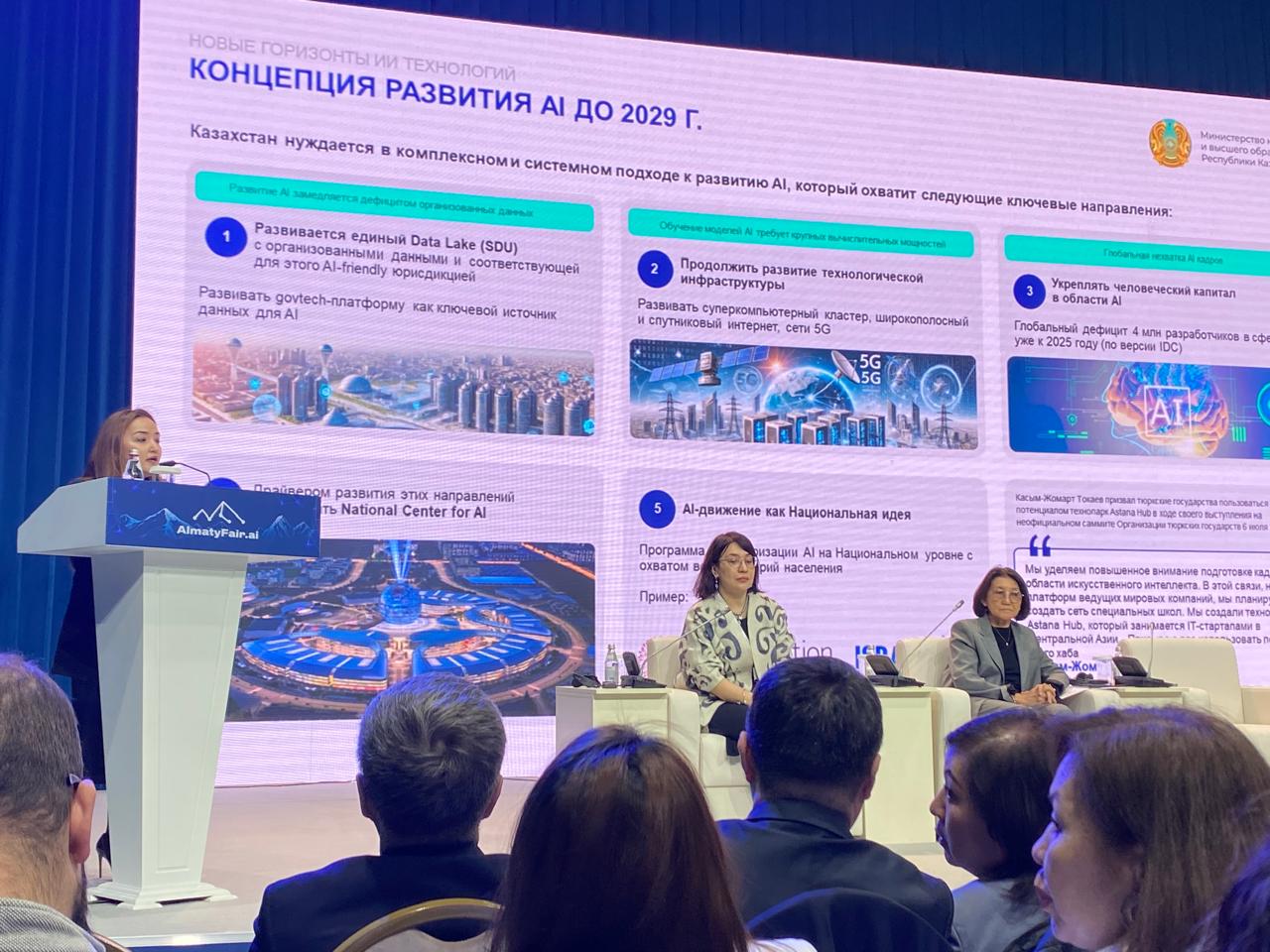 Вице-министр науки и высшего образования РК Динара Щеглова представила инновационную программу «AI-Sana», а также продемонстрировала достижения Министерства в создании академического кластера в стране и интеграции искусственного интеллекта в образование и роли «якорных» вузов в программе. Она отметила, что нулевой этап программы AI-Sana охватит 650 тысяч студентов и обучит их базовыми знаниями в области ИИ, этот этап уже стартовал и продлится до мая текущего года.