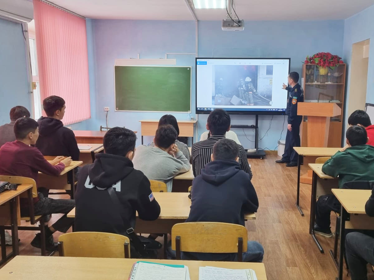 Кабдолов Жарас Жумагельдиевич подробно объяснил студентам как учреждением систематически осуществляются мероприятия по совершенствованию противопожарной защиты и для чего проводятся регулярные мероприятия по предупреждению пожаров путем минимизации риска возникновения чрезвычайных ситуаций, связанных с возникновением пожаров, так же разъяснил студентам организационную структуру учреждения безопасности и охраны окружающей среды, которое находится под контролем департамента гражданской обороны и чрезвычайных ситуаций.