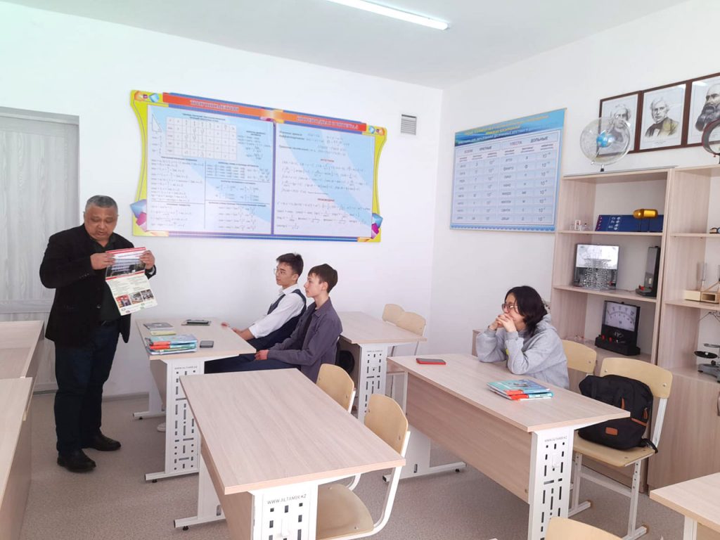 В ходе встречи ведущий специалист отдела профориентационной работы и приема Жанияров Кабибулла Кенжеевич и специалист отдела профориентационной работы и приема Алдонгаров Болатбек Райханович рассказали выпускникам школы о преимуществах обучения в ЗКИТУ, условиях поступления в вуз.