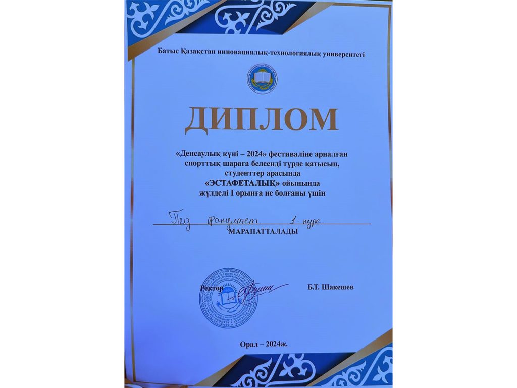 25 сентября 2024 года в стадионе имени Петра Атояна прошел День Здоровья для университетов ЗКИТУ. Ежегодное проведение Дня Здоровья стало традицией в нашем университете. Он проводится для того, чтобы наши студенты, кураторы, родители могли понять, как много значит здоровье в их жизни. Мероприятие началось со вступительного слова проректора по воспитательной работе ЗКИТУ Абекешева Аянбека Иманбаевича. Кафедрой физической культуры и информатики были организованы различные соревнования, такие как, бег на средние и длинные дистанции, перетягивание каната, поднятие гири и т.д. Студенты активно участвовали в соревнованиях. Студенты  ПД-111 кафедры иностранных языков и переводческого дела заняли 1-е и 3-е места в эстафете.