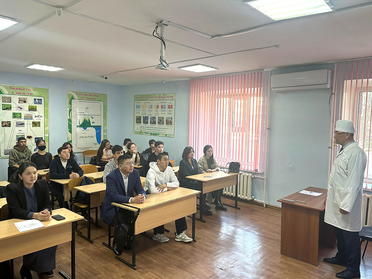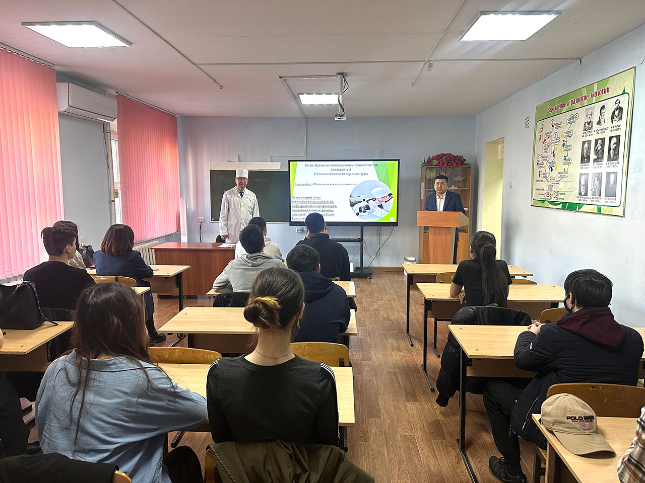 В соответствии с программой мероприятия «Декада науки-2024» 4 апреля 2024 года Института отраслевых технологий ЗКИТУ, приуроченного ко «Дню работников науки» в Казахстане, кафедрой ветеринарии и техносферной безопасности организована встреча обучающихся ОП 6В09103 «Ветеринария», 6В09101 «Ветеринарная медицина» доктором биологических наук, профессором Канатбаевым С.Г. В ходе встречи профессор Серик Ганиевич поделился с обучающимися своим видением и научным опытом по теме: «Путь к науке». В формате презентации рассказал и продемонстрировал обучающимся этапы становления своей научно-педагогической деятельности. Профессор подробно рассказал о своей биографии, о том, где получил образование, как пришел в науку и о своих научных достижениях.