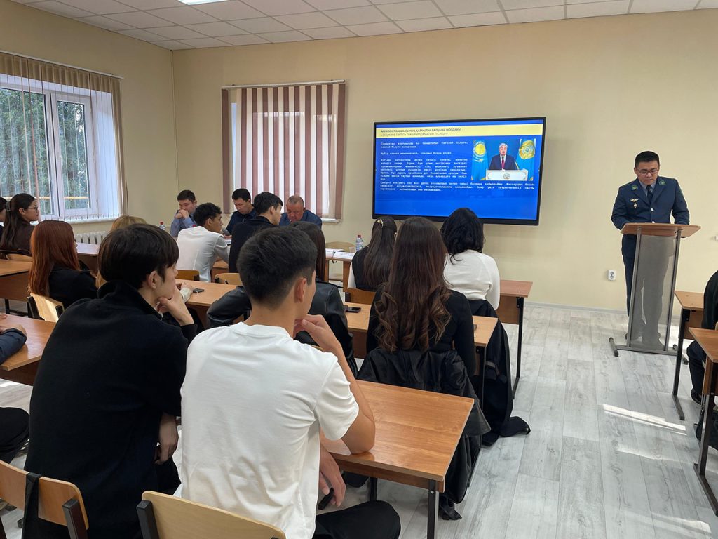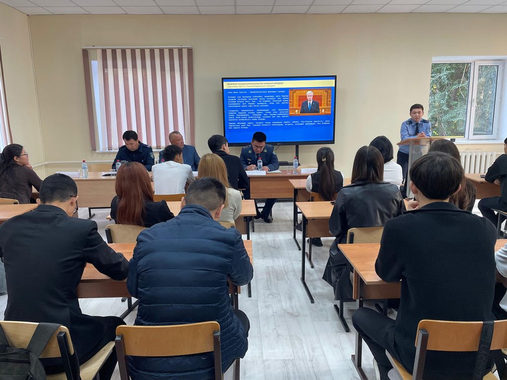 Подполковник полиции Бапенов Н.Б обратил внимание студентов, что в Послании Президент страны обращает большое внимание обучение и воспитание молодежи, выражает на них большую надежду как на патриотов нашей страны, которые будут строить Новый ,Справедливый Казахстан. Призвал студентов к добросовестной учебе, соблюдению здорового образа жизни , занятия физкультурой и спортом. Довел критерии для поступления кандидатов в органы внутренних дел. Привел примеры поступления выпускников 2025г кафедры Права в ряды полиции в нашем регионе. Пригласил студентов для прохождения практики и трудоустройства в полицию.