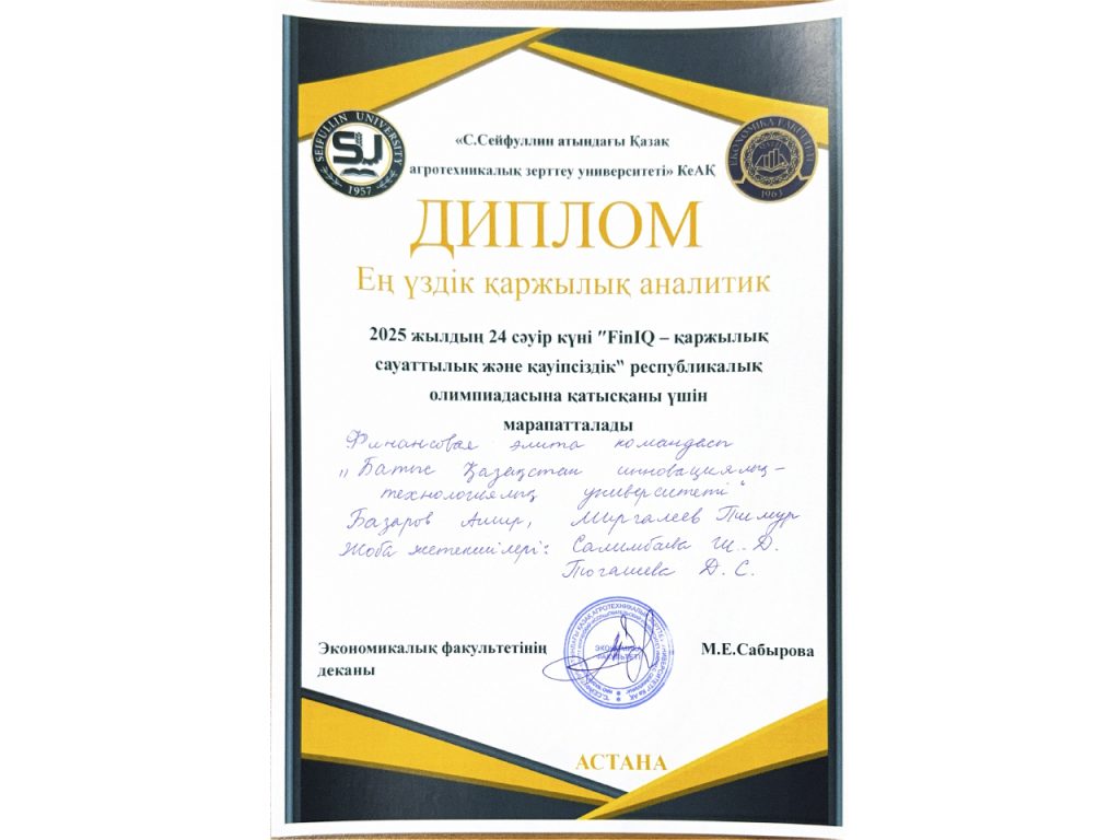 В республиканской олимпиаде по финансовой грамотности и безопасности среди студентов бакалавриата образовательных программ экономического направления, организованной кафедрой «Учет и финансы» Экономического факультета Казахского агротехнического исследовательского университета имени С. Сейфуллина на тему «FinIQ – финансовая грамотность и безопасность» приняли участие обучающиеся 3 курса ОП 6В04106 – Финансы Миргалеев Тимур и Базаров Амир, научные руководители – магистры экономических наук, ст.преподователи Салимбаева Ш.Д. и Тогашева Д.С.