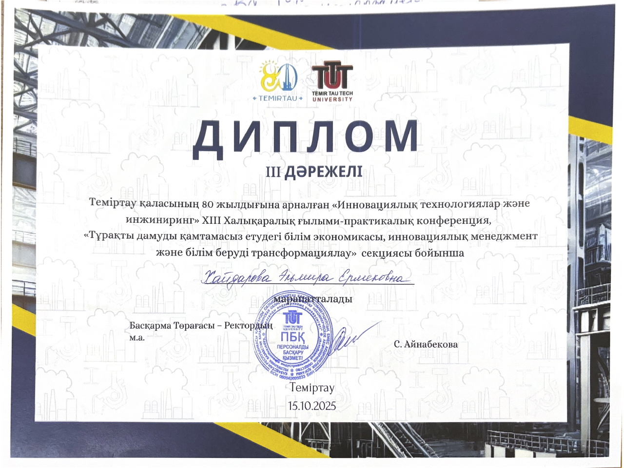 15 октября 2025 года в г. Темиртау на базе Карагандинского индустриального университета проведена XIII Международная научно-практическая конференция «Инновационные технологии и инжиниринг», приуроченная к 80-летию г. Темиртау. Конференция проходила по трем направлениям. В секции «Экономика знаний, инновационный менеджмент и трансформация образования в интересах устойчивого развития» принимала участие Хайдарова Эльмира, студентка III курса образовательной программы «Экономика» с докладом «Изменение характера занятости в глобальной экономике». По итогам выступления Хайдарова Эльмира заняла III место и награждена дипломом III степени. Научные руководители – к.э.н., ассоциированный профессор Курманова Г.К. и м.э.н., старший преподаватель Уразова Б.А. Поздравляем нашу студентку и научных руководителей с успешным выступлением!