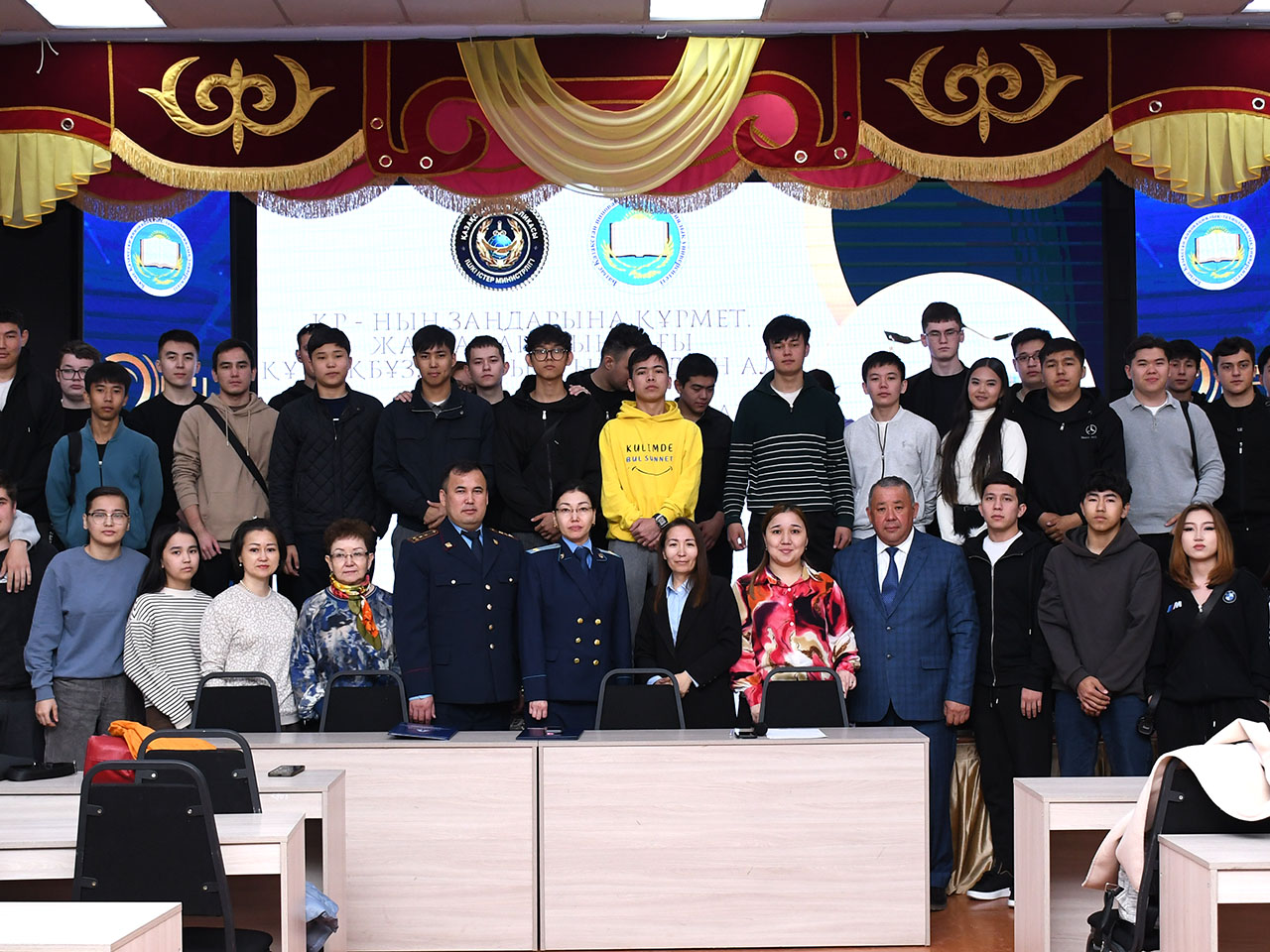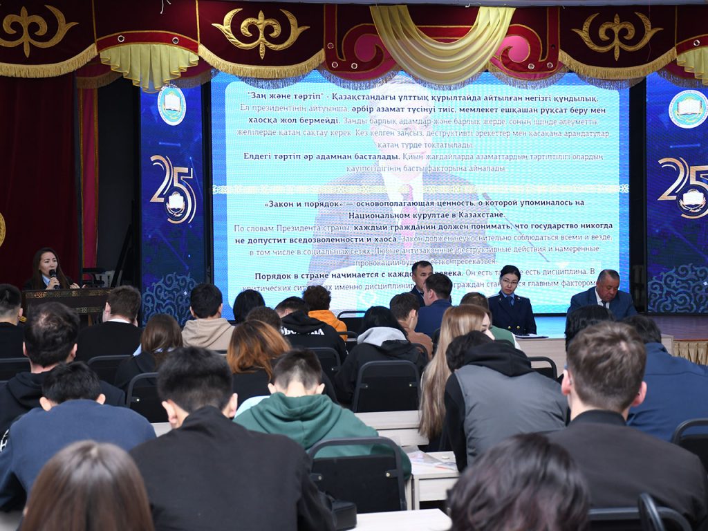 Модератор мероприятия руководитель комплаенс службы ИОТ, ассоциированный профессор кафедры права, к.ю.н., полковник полиции в запасе Рахметов Т.Х. представил гостей преподавателям и студентам остановился на важности соблюдения концепции «Закон и порядок» и «Адал Азамат» всеми гражданами и особенно молодежью, как это требует Глава нашего государства Токаев К.К. в своих обращениях послания Народу Казахстана от 2 сентября 2024 г. и на 4-ом Национальном курултае 15 марта 2025 г.