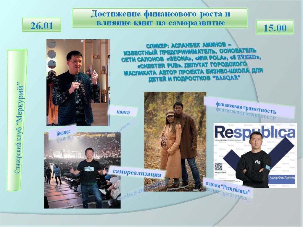 26 января 2024 года ст.преподаватели кафедры общеобразовательных дисциплин Исагулова Т.Р., Султангалиева А.А., Маметанова С.Т. вместе с обучающимися ОП «Архитектура, «Безопасность жизнедеятельности и защита окружающей среды» посетили Областную универсальную научную библиотеку имени Ж.Молдагалиева. В библиотеке состоялась встреча на тему «Достижение финансового роста и влияние книг на саморазвитие», со спикером Аминов Асланбек – известный предприниматель, основатель сети салонов «GEONA» «MIR POLA», «5 ZVEZD», «CHESTER PUB», депутат городского маслихата, автор проекта бизнес-школа для детей и подростков «BASQAR».