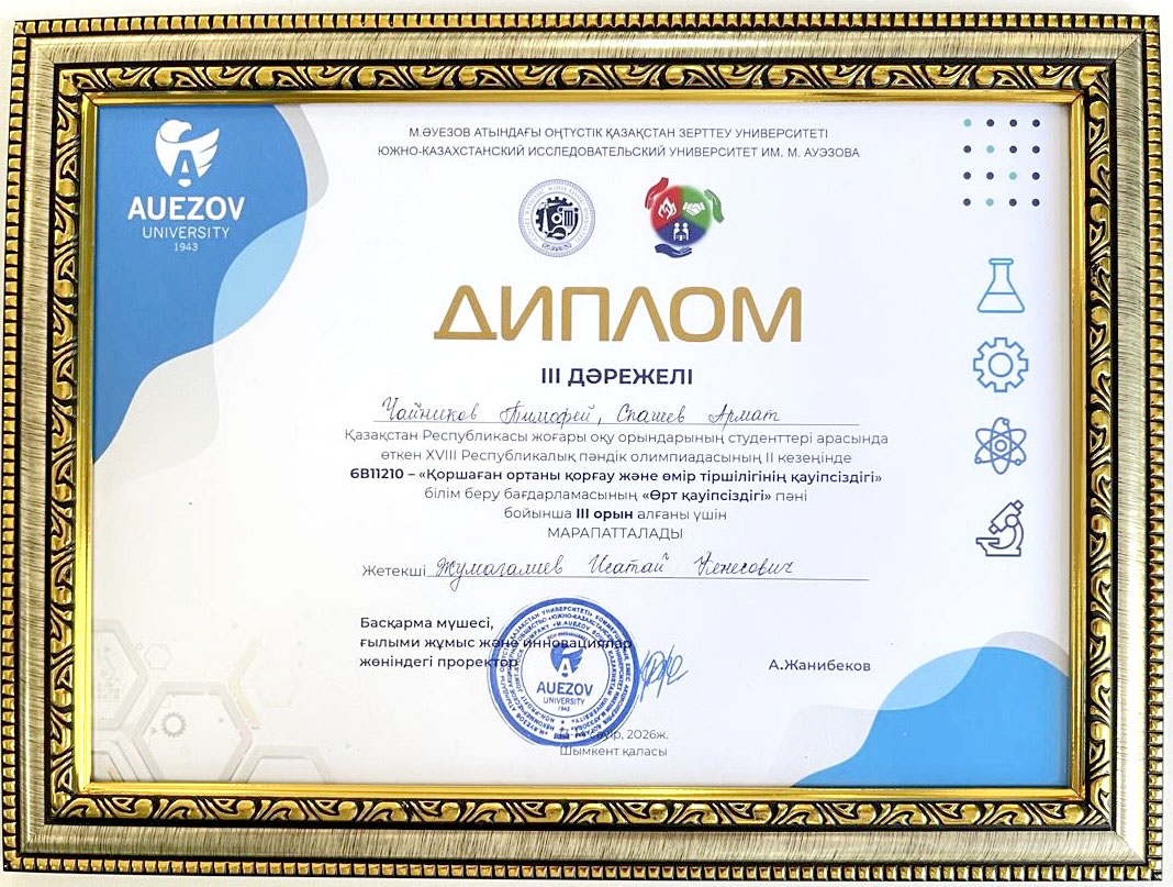 Обучающиеся ОП 6В11201 Безопасность жизнедеятельности и защита окружающей среды Института отраслевых технологий Западно-Казахстанского инновационно-технологического университета Чайников Тимофей и Спашев Армат – успешно приняли участие в олимпиаде и заняли призовое III место (руководитель ст. преподаватель кафедры ВиТБ, магистр наук Жумагалиев И.К.).