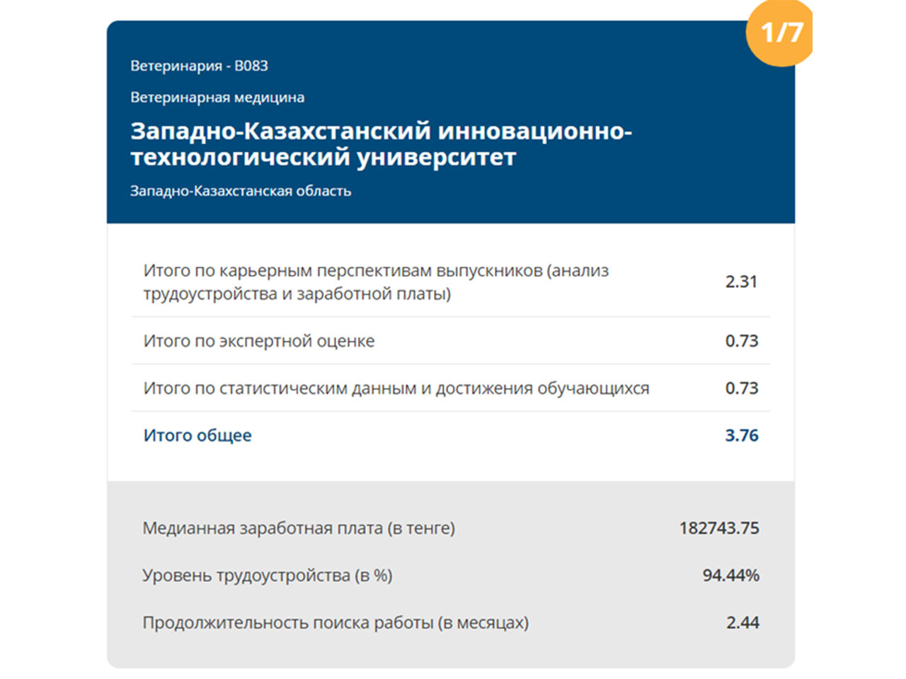 По итогам рейтинга 2022 года, проведенным НПП РК «Атамекен», образовательная программа 6В09101 — Ветеринарная медицина кафедры ветеринарии и техносферной безопасности Инженерно- гуманитарного факультета ЗКИТУ была признана лучшей и заняла 1 место среди вузов Казахстана, ведущих обучение по этой ОП.