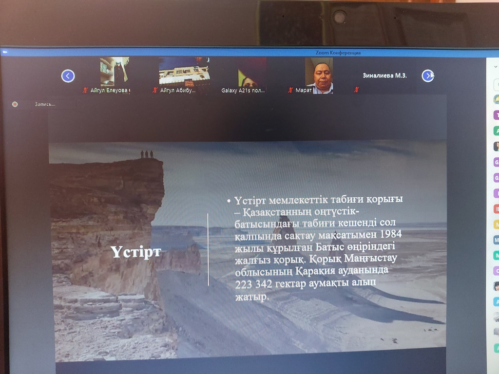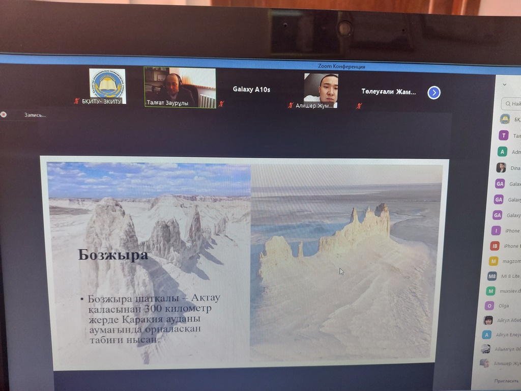 8 апреля 2021 года кафедрой «Истории и права» Западно – Казахстанского инновационно-технологического университета в рамках серии лекций, посвященных 30-летию Независимости Республики Казахстан, была прочитана лекция магистра естественных наук, старшего преподавателя кафедры естественно-научных дисциплин Бегилова Талгата Зауровича «Природные достопримечательности Независимого Казахстана». Лекция прошла в формате ZOOM. В лекции приняли участие около 50 слушателей.