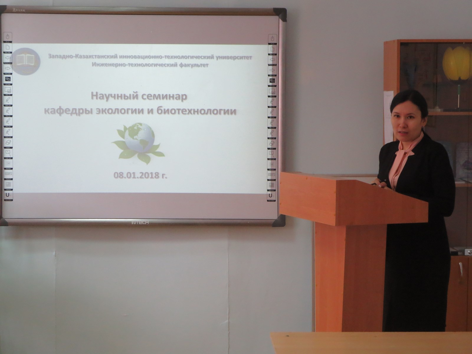 8 января 2018 года на кафедре экологии и биотехнологии инженерно-технологического факультета ЗКИТУ состоялось заседание научного семинара кафедры. На семинаре с итоговым отчетом по научному проекту в рамках грантового финансирования Комитета Науки МОН РК на 2015-2017 годы выступила научный руководитель проекта, проректор по научной работе и международным связям, д.х.н., профессор Бурахта В.А. О научно-исследовательской работе в рамках международного сотрудничества с зарубежными вузами-партнерами выступила к.б.н., доцент Джубаялиева А.К.