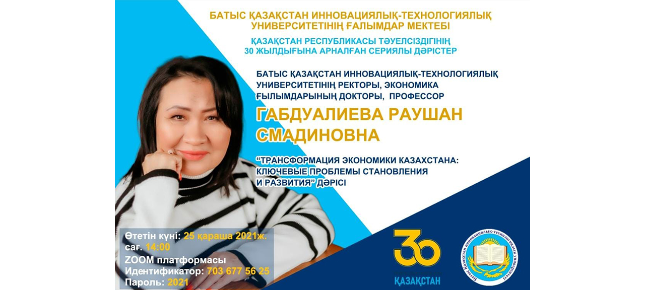 25 ноября 2021 года кафедрой «Истории и права» Западно – Казахстанского инновационно-технологического университета в рамках серии лекций, посвященных 30-летию Независимости Республики Казахстан, доктор экономических наук, профессор, ректор Западно-Казахстанского инновационно-технологического университетаГабдуалиева Раушан Смадиновна выступила с лекцией «Трансформация экономики Казахстана: ключевые проблемы становления и развития». Лекция прошла в формате ZOOM.