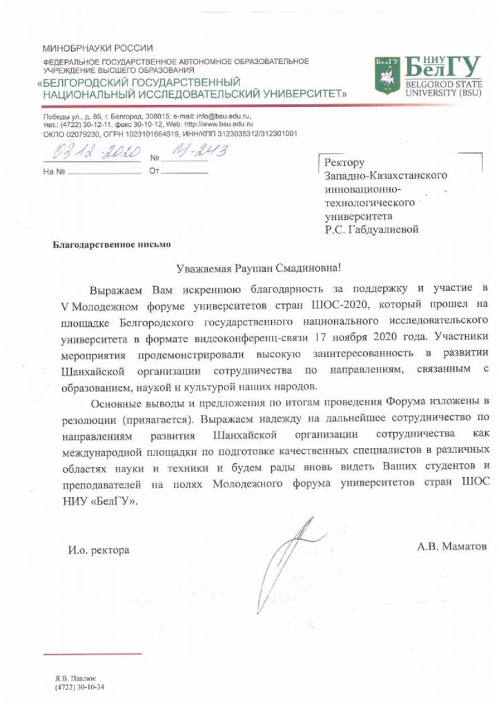 Преподаватели и обучающиеся Западно-Казахстанского инновационно-технологического университета приняли участие в работе V Молодежного форума университетов стран ШОС–20, который состоялся 17 ноября 2020 года на базе Белгородского государственного национального исследовательского университета.