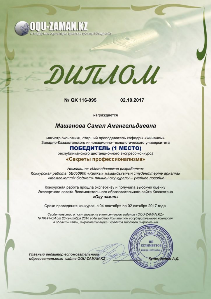 В номинации «Методические разработки» преподаватели награждены дипломом за I место, представившие конкурсную работу «Мемлекеттік бюджет» пәнінен оқу құралы (учебное пособие).
