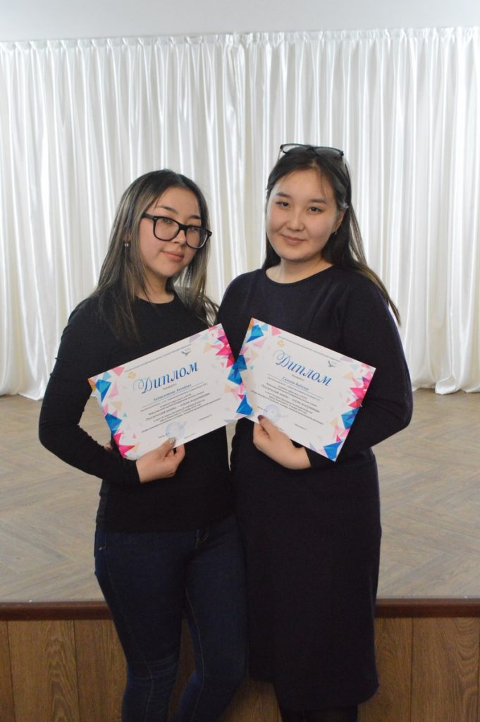 1 место – Толекбаева Данагуль, студентка III курса специальности «Государственное и местное управление» с докладом на тему «Қазақстан Республикасында мемлекеттік жастар саясатын дамытуды пайымдау». Научный руководитель — магистр экономических наук, ст.преподаватель Тулегенова Айнагуль Утегеновна